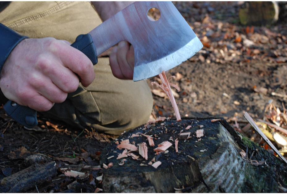 De Japanse Ono bijl, geïnspireerd op de Europese bijl, is geschikt voor het hakken van dunne takken en ideaal om mee te nemen tijdens het kamperen. De bijl wordt geleverd met een beschermhoes die aan de riem kan worden bevestigd, en het gat in het blad maakt ophanging aan een haak mogelijk.