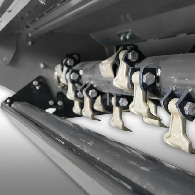 Pendelend opgehangen, verzinkte lamellen aan de voorzijde verhinderen het ontsnappen van stenen en ander materiaal