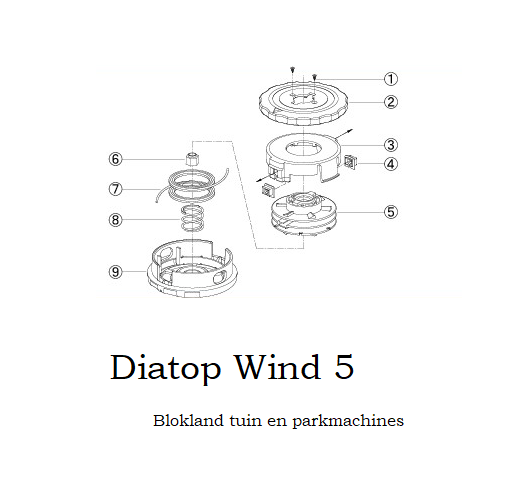 Nr. 1 schroef ,Nr. 2 Afdekkap rood ,Nr. 3 Afdekkap onder ,Nr. 4 Draaddoorvoer oog ,Nr. 5 Draadspoel ,Nr. 9 Onderkap ,Nr.8 Veer |