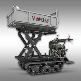 De Jansen® RD-800PRO is de krachtige en flexibele uitbreiding op de RD-800. Met het hydraulische hoogkiepsysteem tilt deze rupsdumper uw werk naar een hoger niveau. Dankzij het sterke hydraulische systeem kunt u probleemloos zware lasten tot 1000 kg kiepen — ook op ruw terrein, dankzij robuuste rupsbanden.